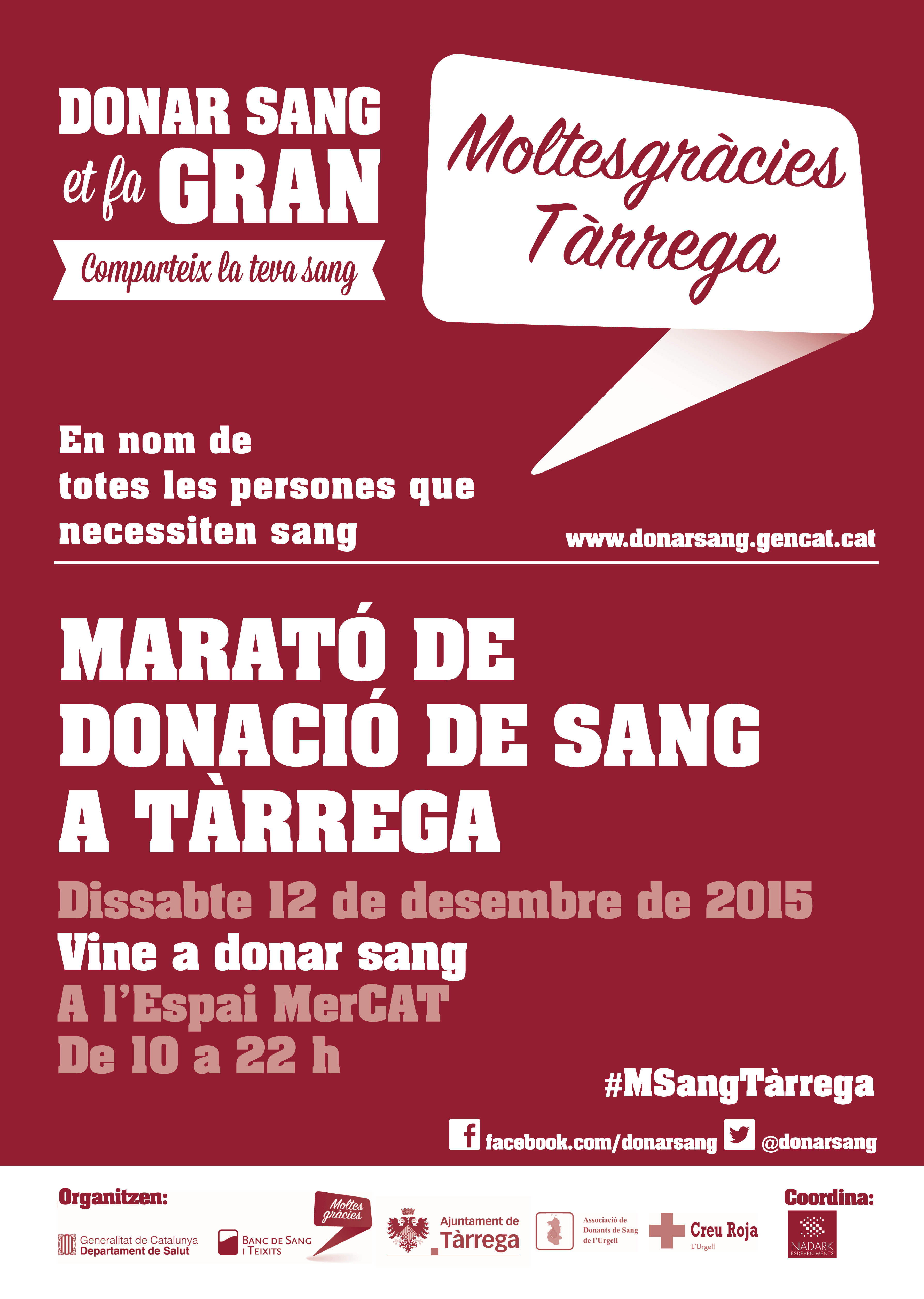 El pròxim dissabte 12 de desembre, de 10 a 22 h, Tàrrega acull una nova edició de la Marató de Donació de Sang a l’Espai MerCAT. La campanya, organitzada pel Banc de Sang i Teixits (BST), compta amb la implicació de l’Ajuntament de Tàrrega, l’Associació de Donants de Sang de l’Urgell i la Creu Roja de Tàrrega.
