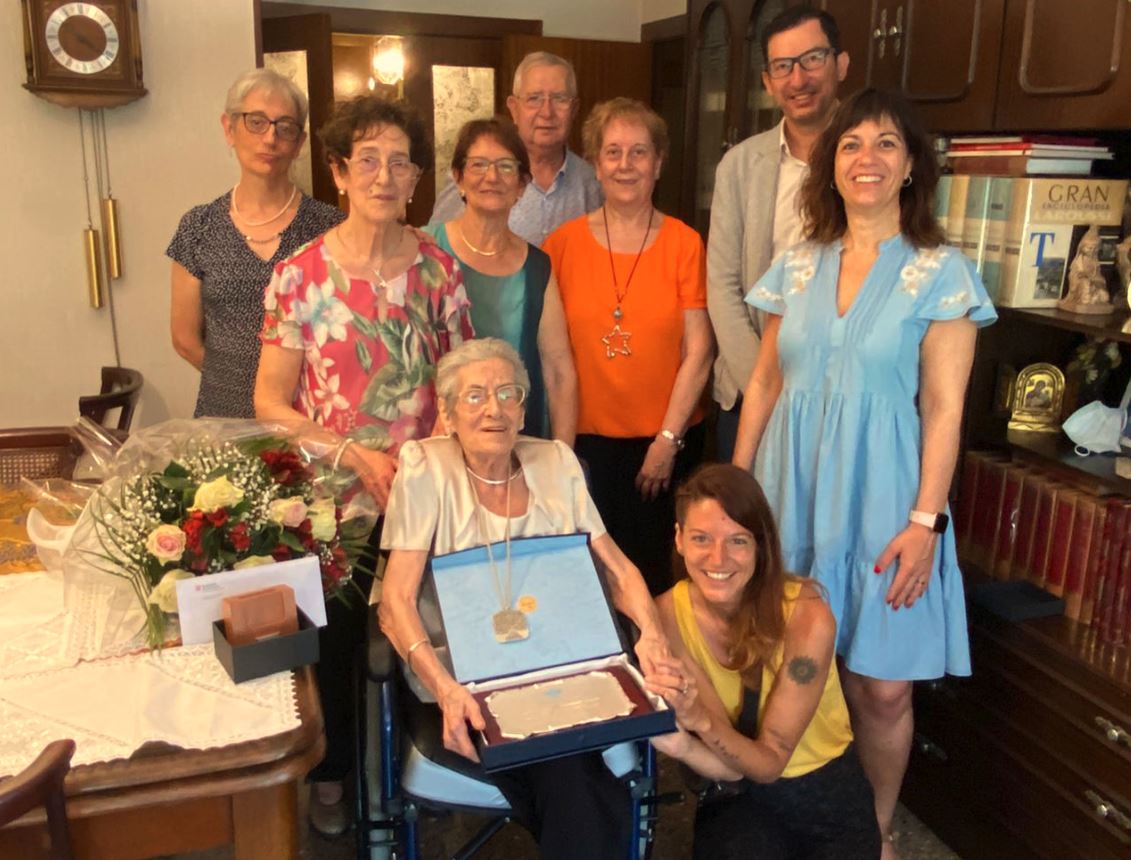 Anna Palou Cucurull, veïna de Tàrrega que ha complert 100 anys de vida, ha rebut un homenatge institucional per tan assenyalat aniversari. L’alcaldessa Alba Pijuan Vallverdú i el director dels Serveis Territorials de Drets Socials a Lleida, Joan Segura, es van desplaçar dissabte fins al seu domicili per a lliurar-li la Medalla Centenària que concedeix la Generalitat de Catalunya. L’alcaldessa, a més, també li va fer entrega en nom del consistori d’un ram de flors i una placa commemorativa “en reconeixement a tota una vida de plenitud”. Nombrosos familiars van acompanyar l’Anna Palou Cucurull en aquest emotiu acte, transmetent-li el seu amor i caliu en assolir aquest fita.