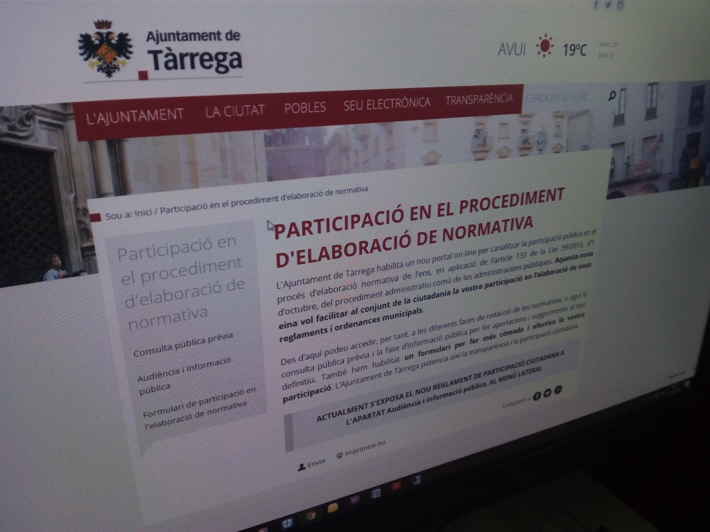 L’Ajuntament de Tàrrega ha habilitat al web municipal un nou portal per canalitzar la participació ciutadana en el procés d’elaboració normativa de l’ens, principalment reglaments i ordenances. Es tracta d’una de les noves eines que el consistori de la capital de l’Urgell ha posat ens servei les darreres setmanes per ampliar els mecanismes de participació ciutadana. El nou portal, al qual es pot accedir mitjançant www.tarrega.cat/participacio, s’ajusta a l’aplicació de la nova llei de procediment de les administracions públiques. Aquí es disposa també d’un formulari on-line per fer arribar aportacions i suggeriments.