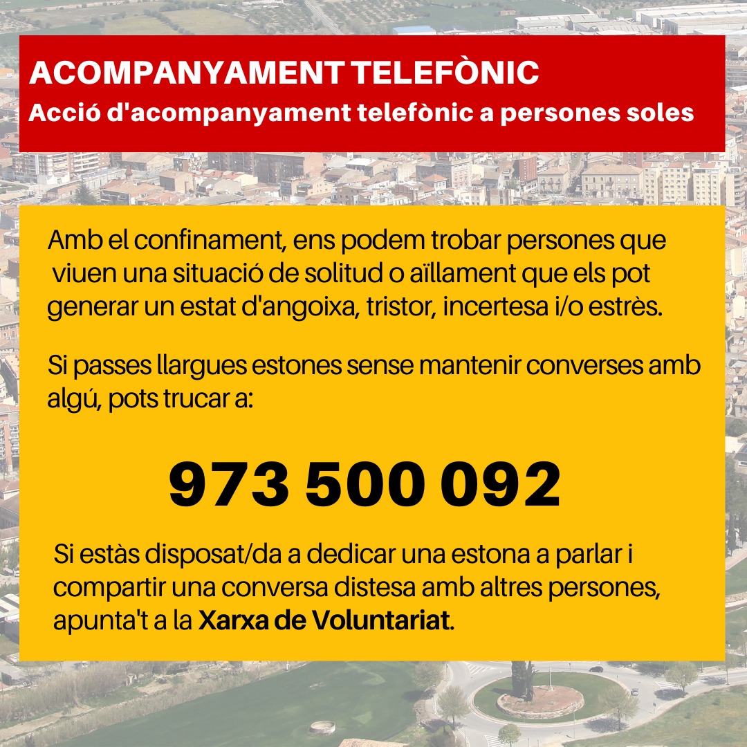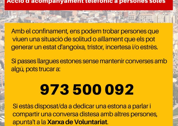 La Xarxa de Voluntariat de Tàrrega afegeix un nou servei al seu ventall d’accions solidàries durant el confinament: l’acompanyament telefònic a les persones que viuen soles. D’aquesta forma, es vol pal·liar la sensació d’incertesa i angoixa que pot provocar la crisi del coronavirus i que es pot agreujar encara més en situacions de solitud. Segons ha explicat avui l’alcaldessa Alba Pijuan Vallverdú, el voluntariat farà un seguiment telefònic diari a persones de qualsevol edat que visquin soles i sol·licitin aquest servei. “Es tracta de tenir algú amb qui poder parlar i traslladar neguits i inquietuds per tot el que està passant”, ha manifestat l’alcaldessa. L’acompanyament telefònic pot por ser una eina terapèutica molt eficaç davant la llarga situació de confinament que ens toca viure”, ha afegit la primera edil.