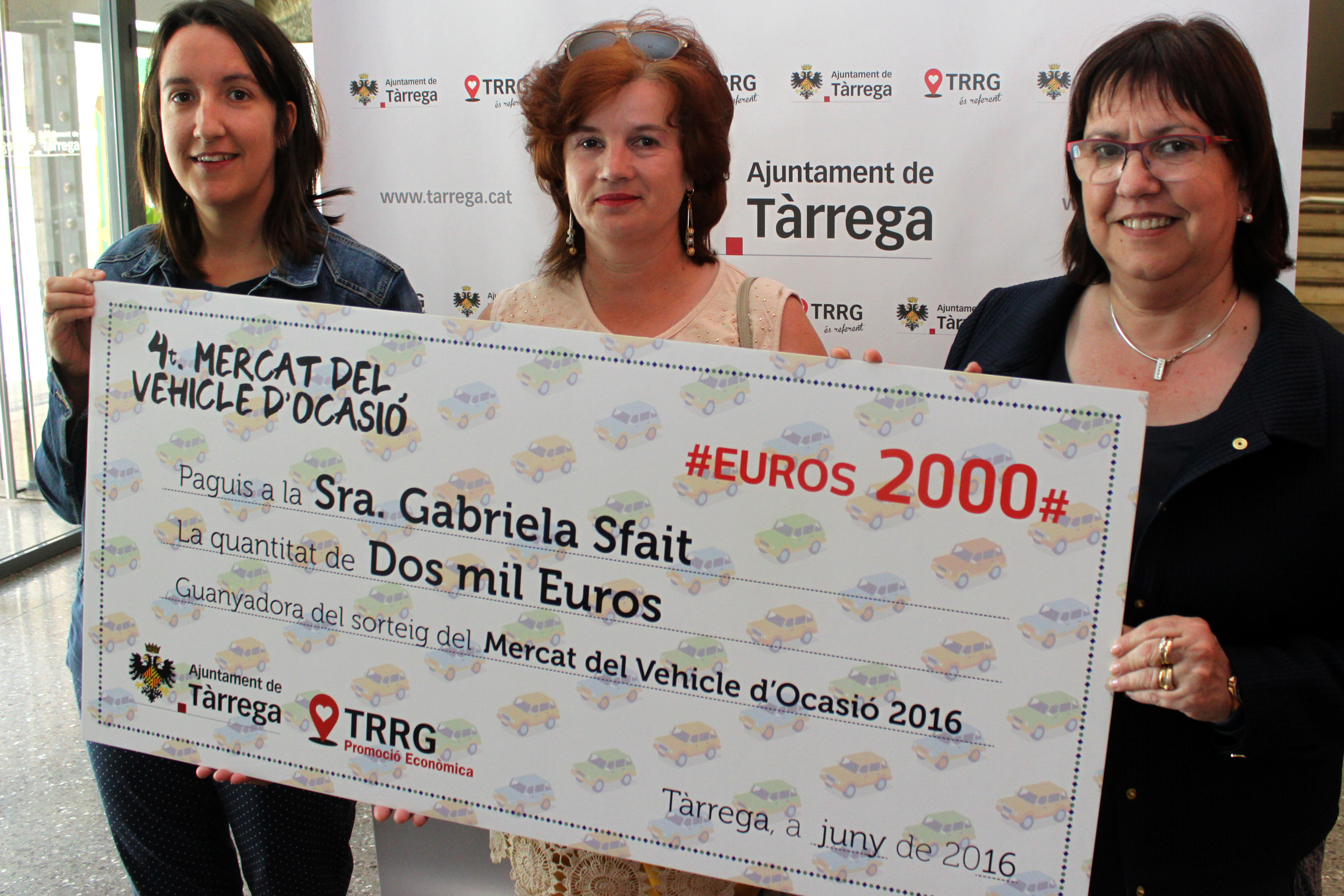 L’Ajuntament de Tàrrega ha lliurat el premi de 2.000 euros en metàl·lic sortejat entre tots els compradors del 4t Mercat del Vehicle d’Ocasió, celebrat a la capital de l’Urgell els passats dies 27, 28 i 29 de maig. L’afortunada ha estat Gabriela Sfait, veïna de Tàrrega, qui adquirí un cotxe a l’estand de l’establiment multimarca Nexcar, amb seu a Les Borges Blanques. Han lliurat el xec Rosa Maria Perelló, alcaldessa de Tàrrega, i Anna Roset, representant de Nexcar. Aquesta ha estat la primera ocasió en què el Mercat del Vehicle d’Ocasió de Tàrrega ha lliurat un premi d’aquestes característiques com a al·licient per als visitants. De fet, la convocatòria se saldà amb èxit ja que els 14 expositors participants tancaren contractes de compravenda corresponents a una vuitantena d’automòbils, una quarta part del total exposat. Organitzat per la Regidoria de Promoció Econòmica amb suport unànime del sector de l’automoció del municipi, el 4t Mercat del Vehicle d’Ocasió posà a l’abast uns 300 models seminous, de segona mà, de quilòmetre 0 i de gerència, des de poc més de 1.000 euros a la zona outlet fins a més de 50.000 euros pel que fa a la gamma alta.