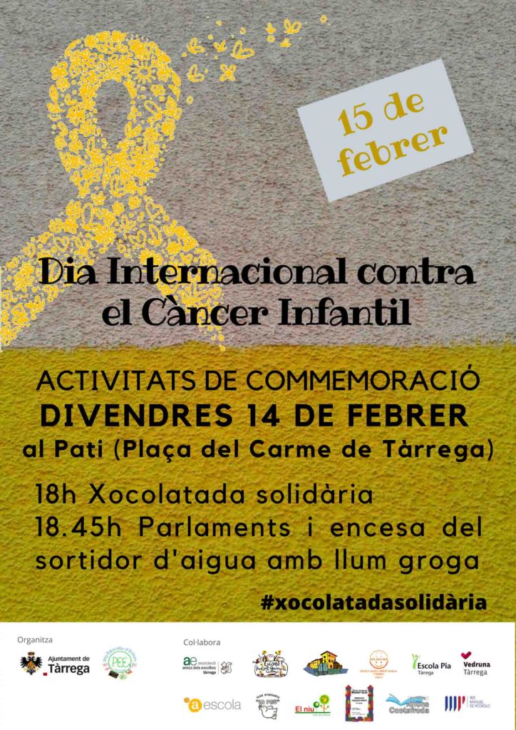 Tàrrega impulsa un nou acte benèfic en favor de la lluita contra el càncer infantil. La iniciativa s’emmarca dins el Pla Educatiu d’Entorn i comptarà amb una àmplia participació de l’àmbit comunitari i social. Es tracta d’una xocolatada solidària que tindrà lloc el divendres 14 de febrer, a les 6 de la tarda, a la plaça del Carme. La convocatòria es desenvoluparà la vigília del Dia Internacional contra el Càncer Infantil (15 febrer) i vol ajudar a recaptar fons destinats a la investigació de la malaltia a l’Hospital Sant Joan de Déu de Barcelona. En el decurs de l’acte, a 3/4 de 7 de la tarda, també es farà l’encesa dels brolladors de la Font del Pati il·luminats de groc, el color que distingeix la solidaritat contra el càncer infantil. “Volem donar visibilitat a la lluita contra la malaltia i expressar el suport a les famílies que hi fan front”, afirma el regidor de Ciutadania i Educació, Xavier Rossell–Aparicio. L’edil també agraeix la ràpida i plena implicació de les escoles de Tàrrega a l’hora de secundar la proposta.