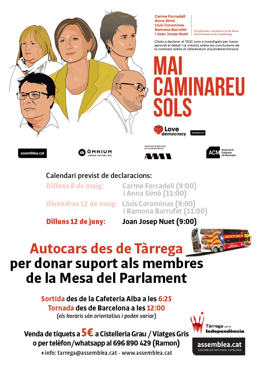 Per dilluns també han programat una altra sortida a Barcelona. En aquest cas per donar suport a Joan Josep Nuet a l’hora de declarar davant el TSJC, igual que Tàrrega per la Independència ha fet amb la resta de membres de la Mesa del Parlament cridats a declarar per haver permès debatre sobre la independència al Parlament. Dilluns està citat a les 9 del matí.