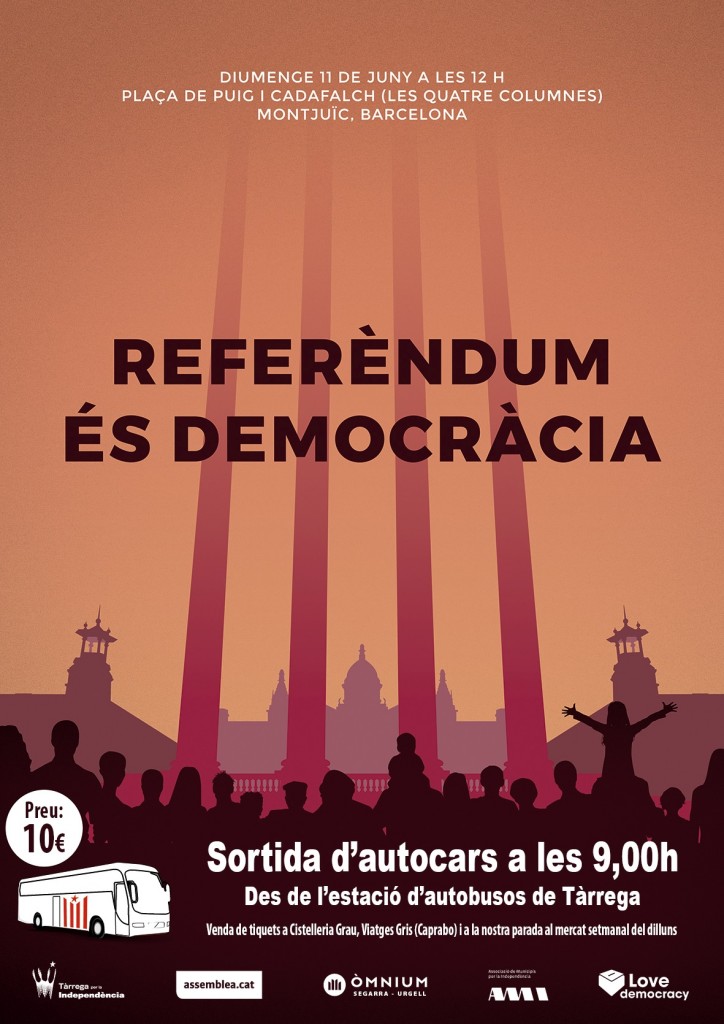 Un cop més Tàrrega per la Independència ha organitzat autocars des de Tàrrega per assistir a la cita. Els punts de venda són els habituals: Cistelleria Grau i Viatges Gris (Caprabo). El preu és de 10 euros i l’autocar surt a les 9 del matí des de l’estació d’autobusos de Tàrrega.