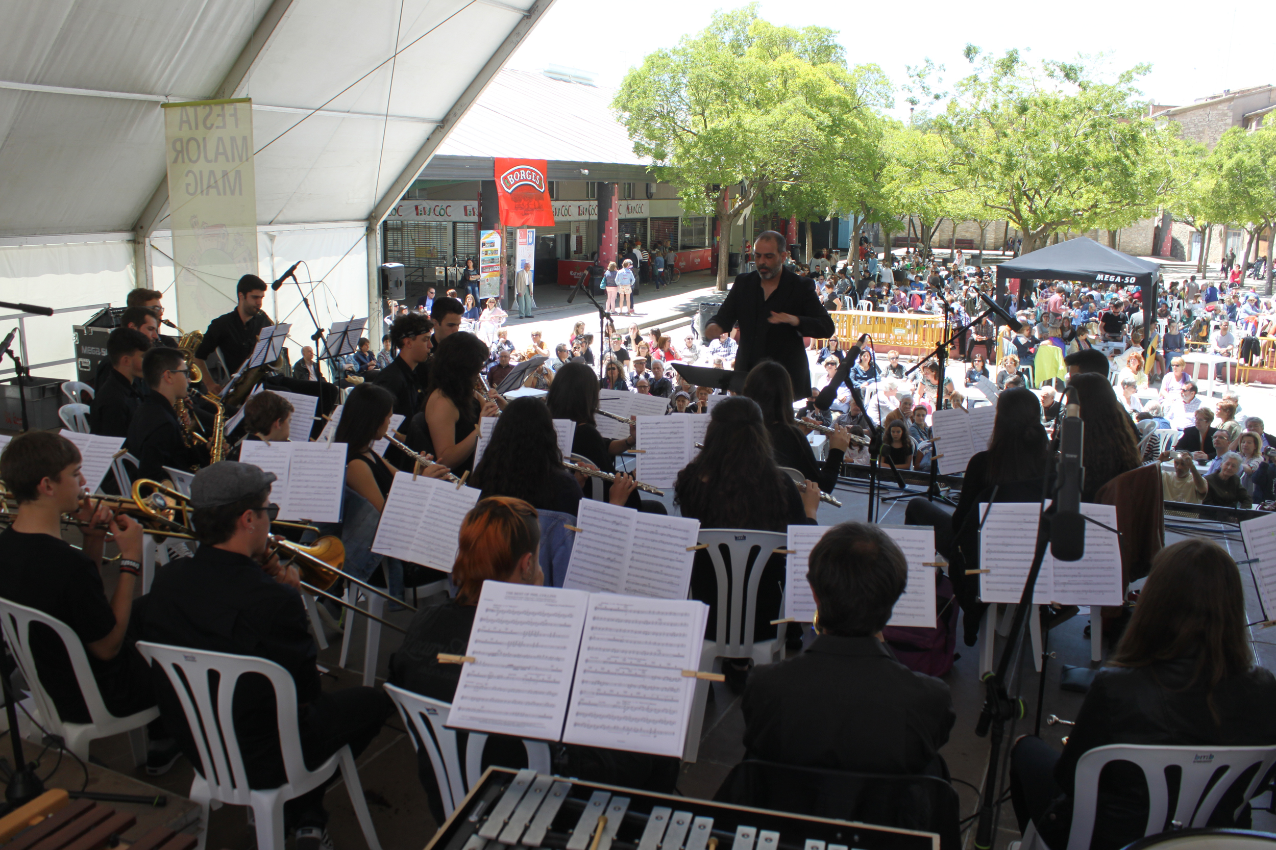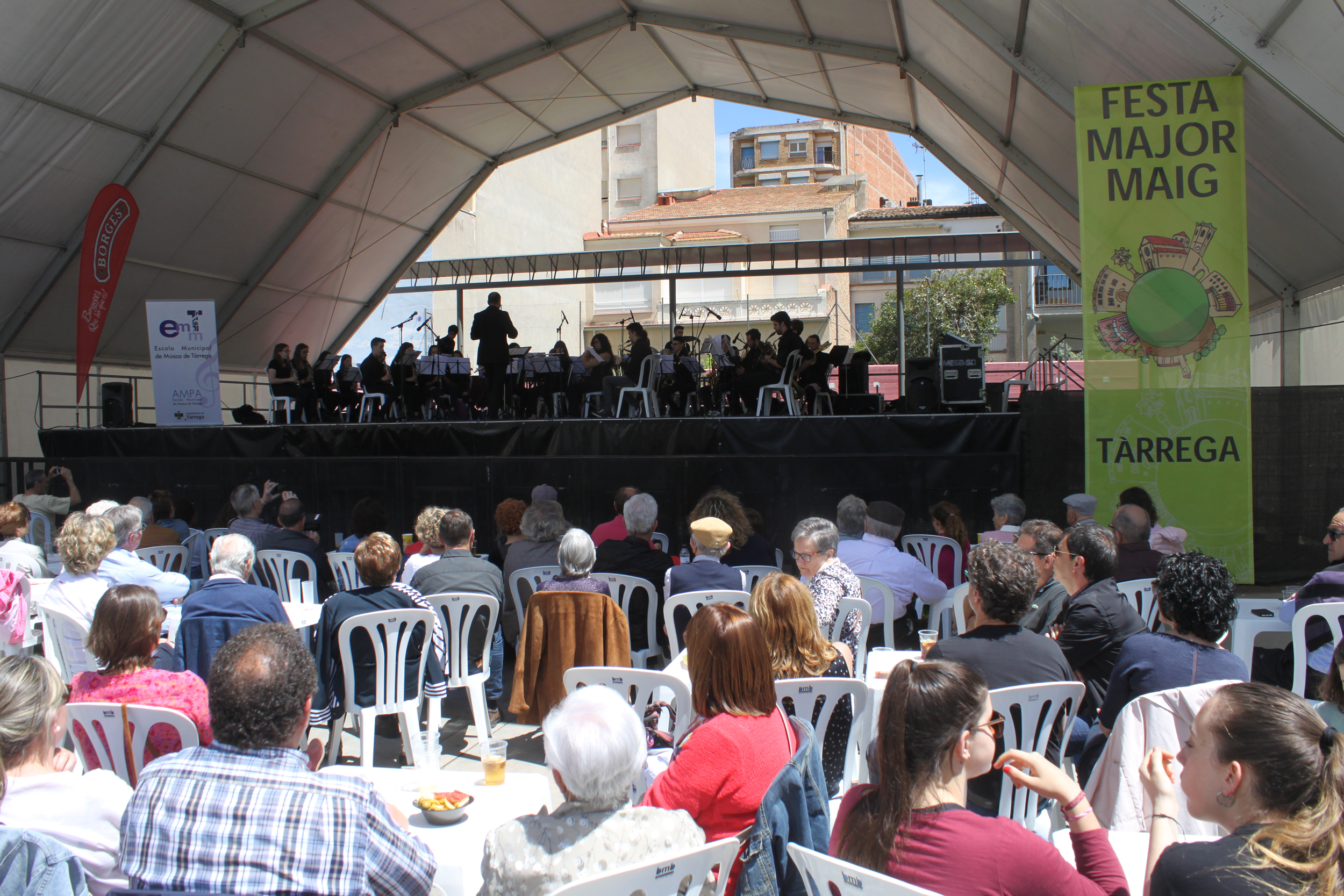 La celebració ha continuat avui amb una matinal d’esports i el tradicional vermut amenitzat per l’Orquestra de Vent de l’Escola Municipal de Música de Tàrrega. Els joves instrumentistes han delectat el nombrós públic congregat a la Plaça de les Nacions sense Estat interpretant composicions clàssiques i melodies de pop-rock. El bon temps regnant també juga a favor de l’èxit de participació de la Festa Major 2017. A la tarda figura al programa la inauguració de l’exposició de bonsais, el ball amb el grup Café Latino, la popular comèdia teatral “Sota teràpia”, sessions de DJs i una festa revival dels anys 80.