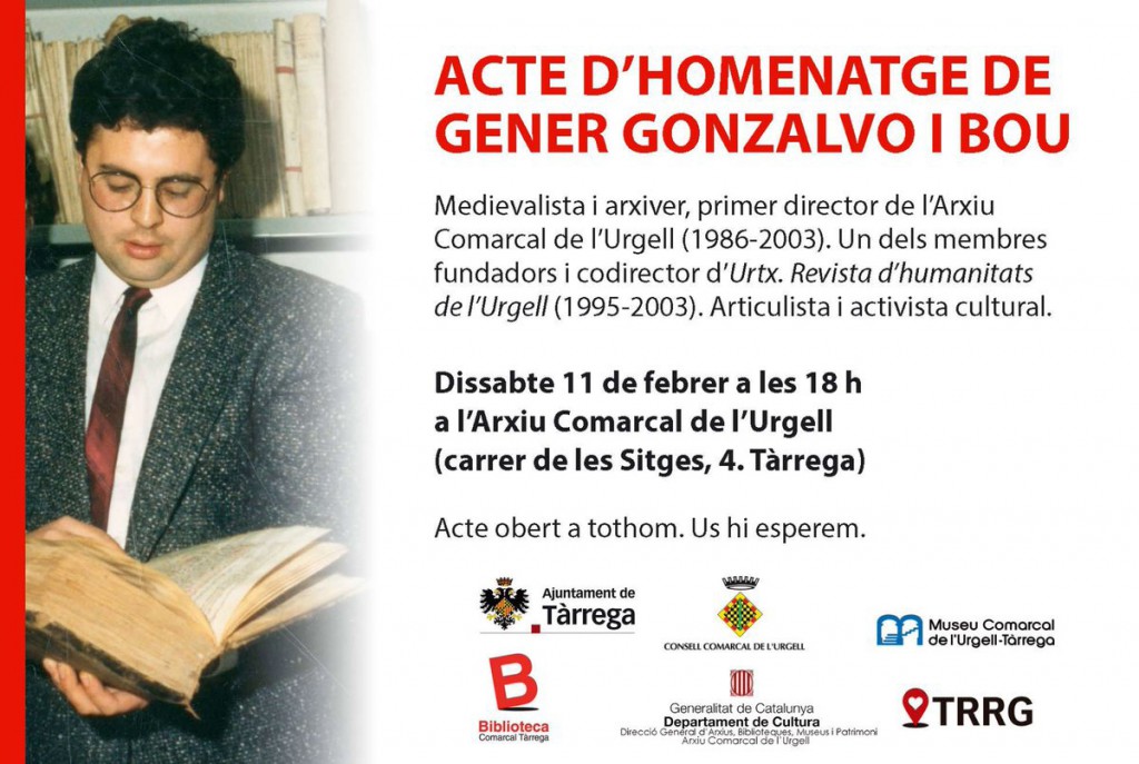 Tàrrega retrà aquest dissabte 11 de febrer un homenatge pòstum a Gener Gonzalvo i Bou, reconegut historiador i arxiver que morí el passat gener a l’edat de 58 anys. Especialista en medievalisme, fou el primer director de l’Arxiu Comarcal de l’Urgell des de la seva inauguració el 1986 fins al 2003. Durant aquesta etapa fonamentà les bases de l’actual equipament, tot realitzant una tasca ingent de recollida de fons i la seva descripció. Cal destacar també la seva feina de difusió del patrimoni documental, de la qual sobresurt la creació de la Col·lecció Ardèvol a més de fundar URTX – Revista d’Humanitats de l’Urgell al costat de Jaume Espinagosa. Gener Gonzalvo ha deixat una profunda empremta a la capital de l’Urgell ja que destacà alhora com a activista cultural i articulista. Abans de la seva trajectòria al capdavant de l’Arxiu Comarcal de l’Urgell, obtingué beques per estudiar la Cancelleria Reial durant el regnat de Jaume II i la paleografia notarial de l’any 1316 a Barcelona.