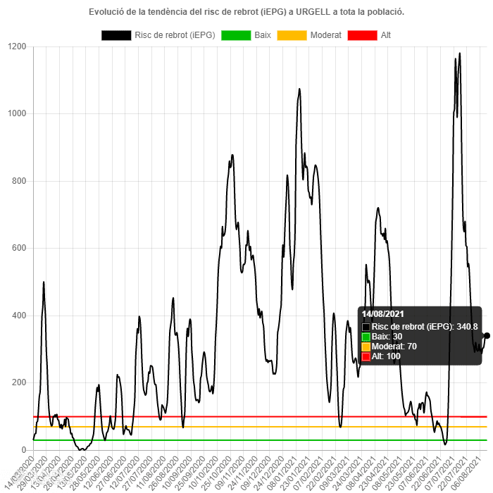 Pel que fa a la comarca de l’Urgell el risc de rebrot a l’Urgell és de 341 i la velocitat de contagi (Rt) és de 1’1.