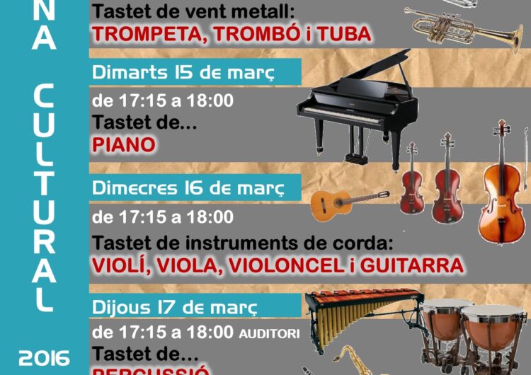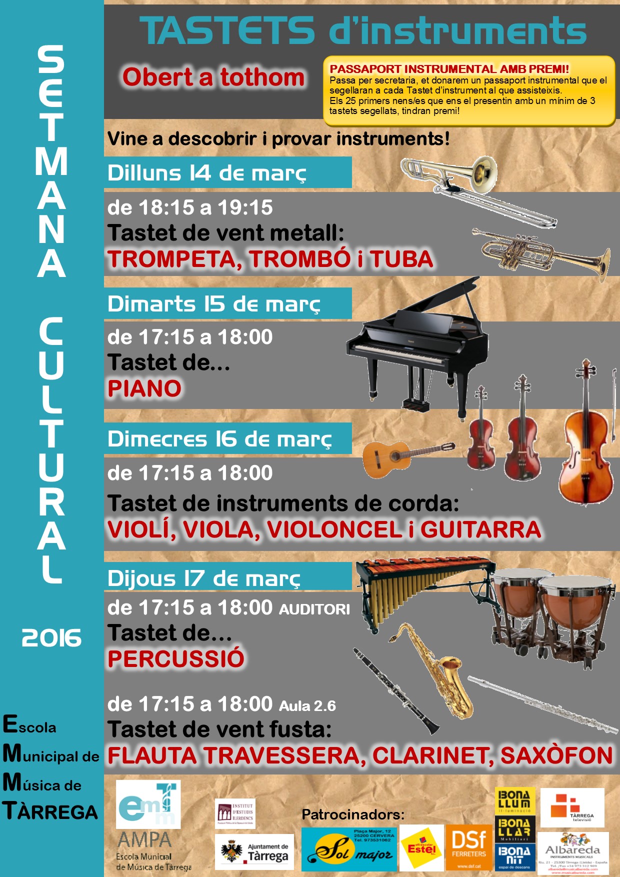 Cultura Tastets d’instruments, avui dimecres i demà dijous a la Setmana Cultural de l’Escola Municipal de Música de Tàrrega Per Tàrrega Televisió 16, març, 2016