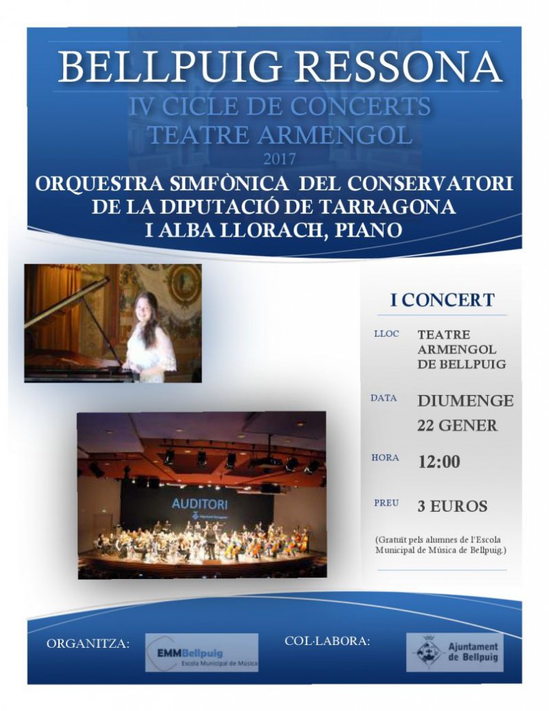 En el primer concert del 4t Cicle “Bellpuig Ressona”, Alba Llorach, alumna del Conservatori de Tarragona, oferirà un recital a la primera part amb obres de Beethoven i Chopin. A la segona part, l’Orquestra Simfònica del Conservatori de la Diputació de Tarragona interpretarà obres de Sibelius i Schubert sota la batuta d’Àlex Sansó.