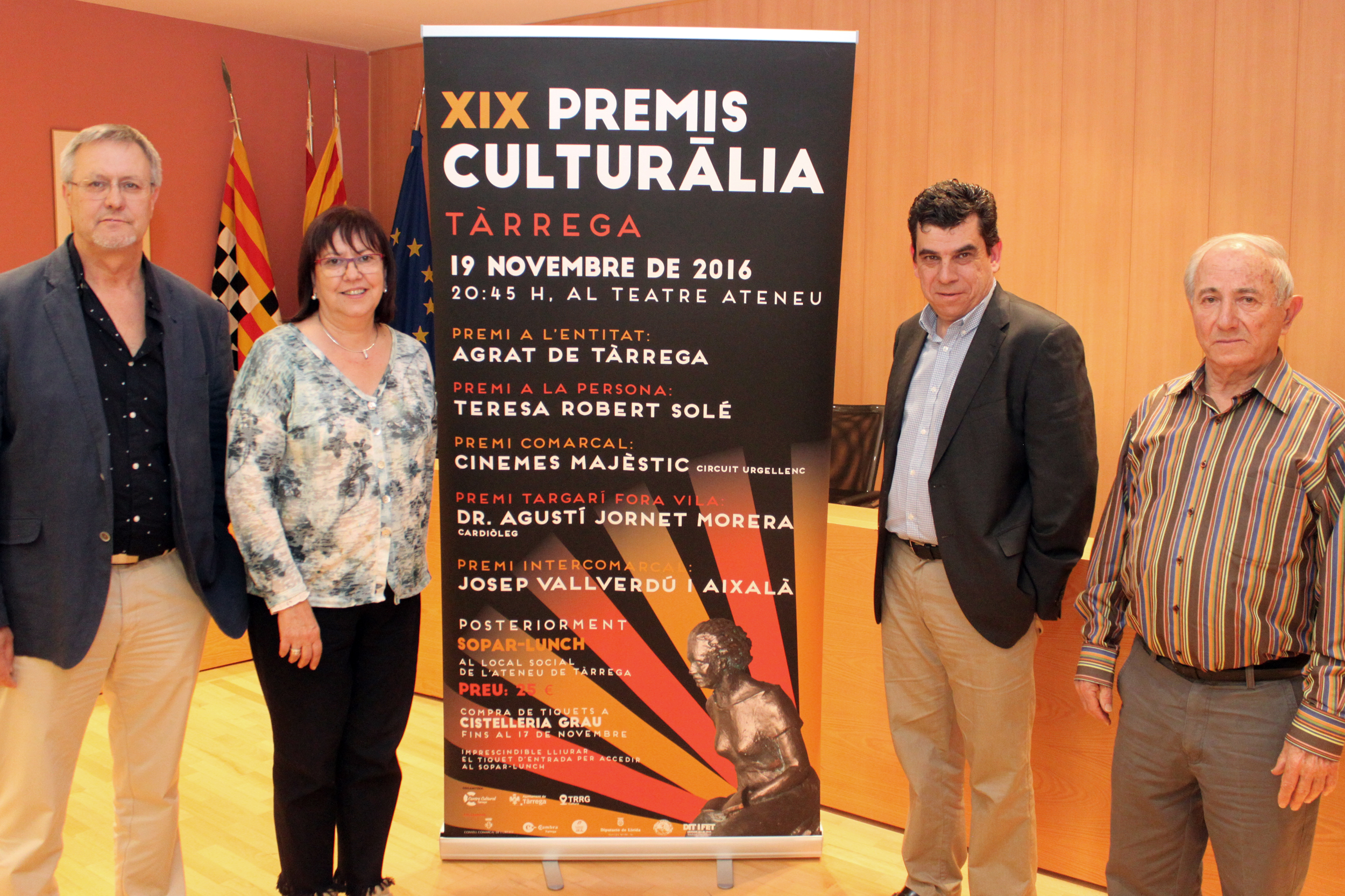 Tàrrega ultima els preparatius per celebrar aquest dissabte 19 de novembre la gala de lliurament dels Premis Culturàlia 2016. Convocats pel Centre Cultural de Tàrrega i la Regidoria de Cultura, es tracta de guardons al mèrit cultural i social que distingiran enguany l’escriptor Josep Vallverdú, el cardiòleg Agustí Jornet, l’activista cultural Teresa Robert, l’Associació Agrat i l’empresa Circuit Urgellenc. L’acte tindrà lloc a 3/4 de 9 del vespre, al Teatre Ateneu de Tàrrega, en el decurs d’una gala oberta a la ciutadania i amb entrada de franc.
