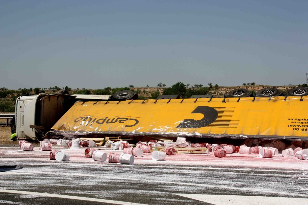 Un vehicle ha bolcat la seva càrrega de pots de pintura, però a causa del sinistre no hi ha hagut cap persona atrapada