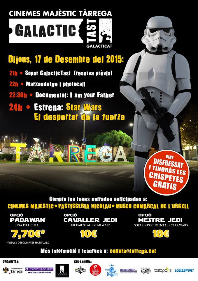 Aquest dijous 17 de desembre, a les 24h., s’estrena a Tàrrega “Star Wars · El despertar de la força” i no és casual que sigui una de les poques sales de Ponent on es projecti la pel·lícula. Fans i cinèfils van posar de seguida fil a l’agulla fa uns dies per organitzar, no solament el passi del film a les 12 de la nit, sinó tota una vetllada on el cinema i sobretot el món creat per George Lucas estigués ben present. I és que aquesta activitat exemplifica, una vegada més, la implicació de la ciutat vers el cinema.