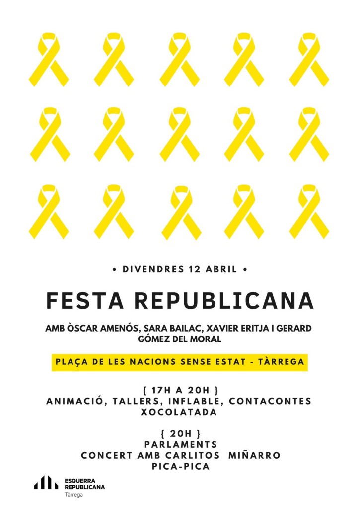 Esquerra Republicana de Catalunya donarà el tret de sortida a la campanya electoral de les eleccions generals del 28 d’abril el proper divendres 12 d’abril a la tarda, amb un seguit d’activitats familiars i un acte polític que tindrà lloc a la plaça de les Nacions sense Estat de Tàrrega.